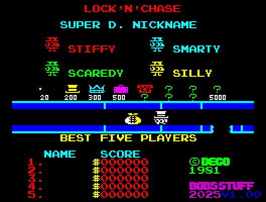 This game is a port of the 1981 Data East Corporation (DECO) arcade game Lock'n'Chase.