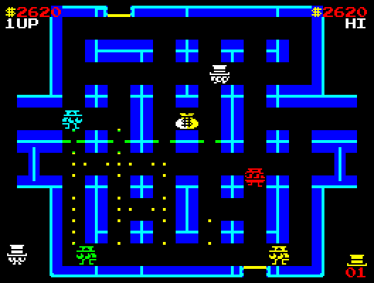 Guide the thief Lupin around the bank vault collecting all the coins before making for the exit, whilst all the while keeping watch for the four pursueing cops (Super D) as they try to block your escape. Use the tunnels on either side to evade capture, and close doors as you go to temporarily stall them. Increase your loot by collecting treasure and money bags en-route should they appear.